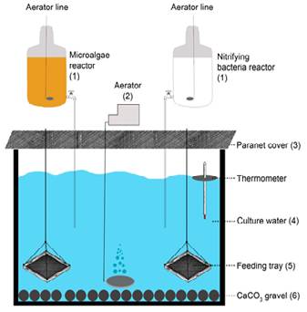 在養(yǎng)殖環(huán)節(jié)開(kāi)始之前,ZWD系統(tǒng)需要被接種10L的硝化細(xì)菌(10 6 CFU/ml)和12L的角毛藻(106 cells/ml),總?cè)萘繛?00L。硝化細(xì)菌的銨根離子分解能力利用添加3gNH4Cl((≈ 10 mg/L 的銨根離子)。直到 NH4+和 NO2-水平減少至接近 0 mg/L調(diào)節(jié)停止。