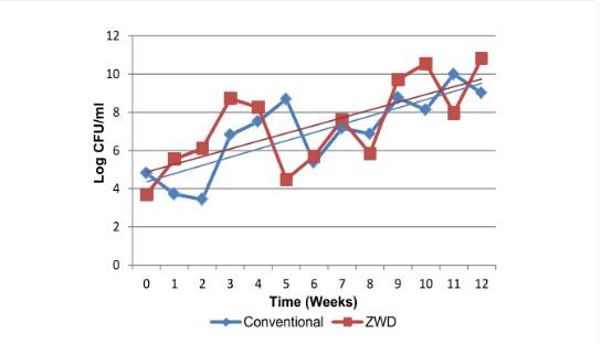 常規(guī)系統(tǒng)和ZWD系統(tǒng)中總細(xì)菌量在十二周養(yǎng)殖周期的數(shù)量展示在圖7。