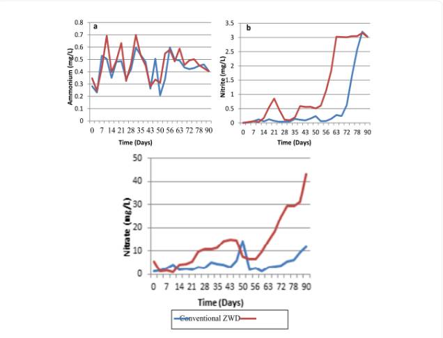 圖5:(a)銨根離子、(b)亞硝酸鹽、(c)硝酸鹽在九十天養(yǎng)殖期間常規(guī)系統(tǒng)和ZWD系統(tǒng)中的水平